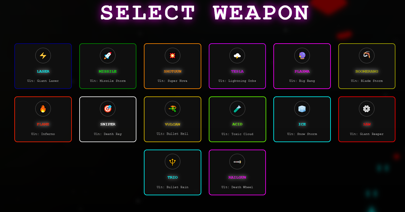 - Massive Arsenal: 14 different primary weapons including Lasers, Boomerangs, Railguns, Saws, and more.