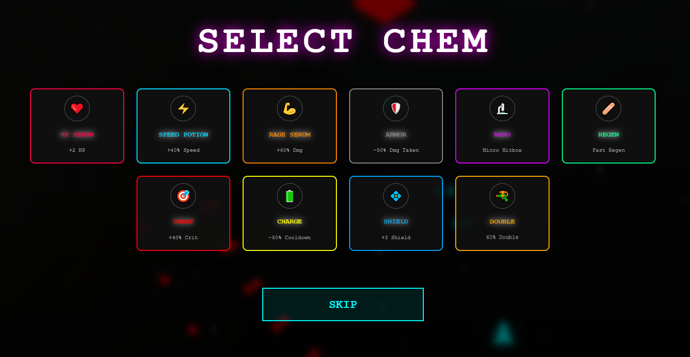 - Chemical Buffs: 10 different upgrades like extra HP, speed, damage, shields, or a microscopic hitbox.